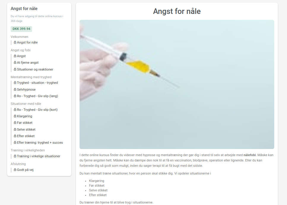 Som et billigere alternativ til hypnoterapi, har jeg lavet dette online videokursus hvor du med hypnose selv kan arbejde med din nålefobi. Videoerne gør det muligt for dig at mentaltræne din hjerne ud af angsten for nåle og situationer hvor du skal stikkes.