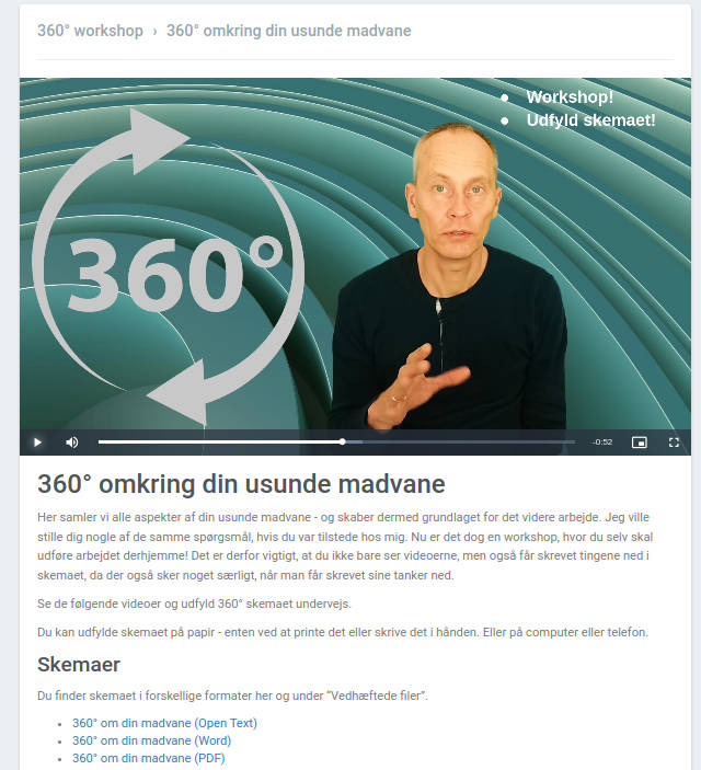 Workshop med 12 videoer, som guider dig igennem spørgsmål kommer 360° rundt om alle aspekter af den usunde madvane, du gerne vil lave om.